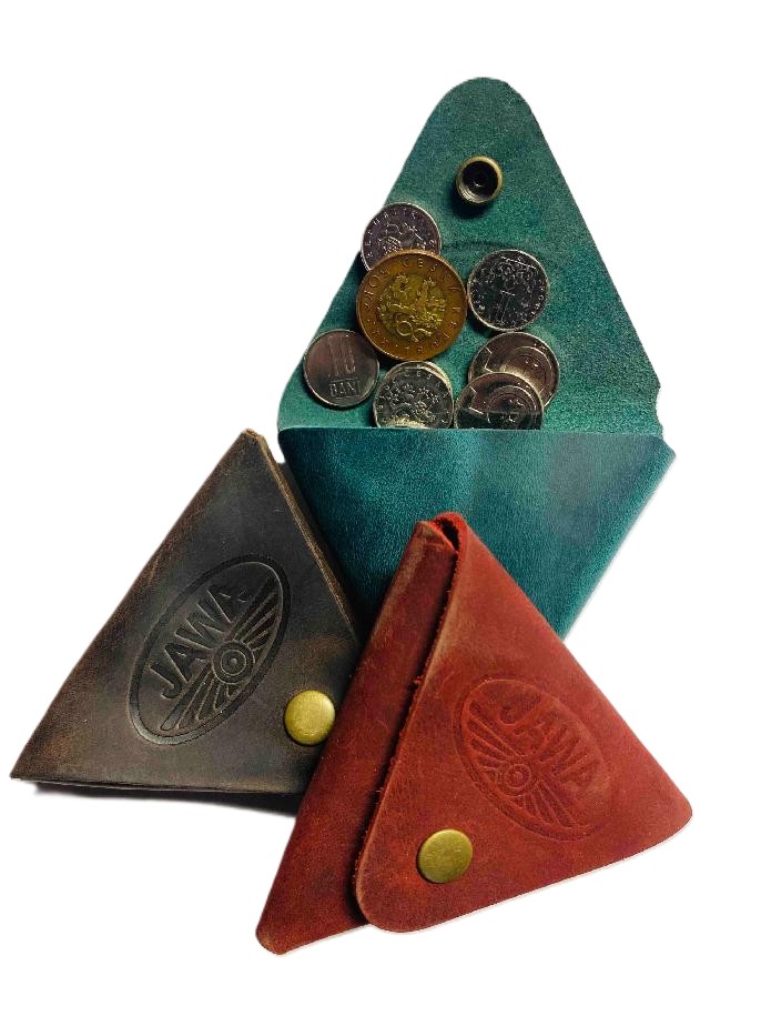 Kožená peněženka “ BERMUDKA“ s logem JAWA na drobné mince. -Rozměr: délka stran 10 cm x 10cm x10cm , hloubka 2cm -Vtipné řešení komor -Tvar trojúhelníku -Vyrobeno v ČR